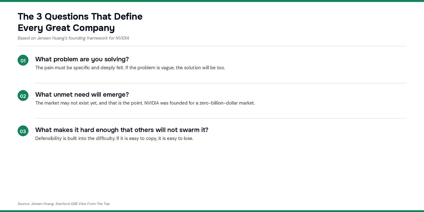 Huang said this, reflecting on NVIDIA’s founding in 1993, when the video game market was worth zero billion dollars. Sequoia’s Don Valentine told him startups should not invest in startups. He funded it anyway.