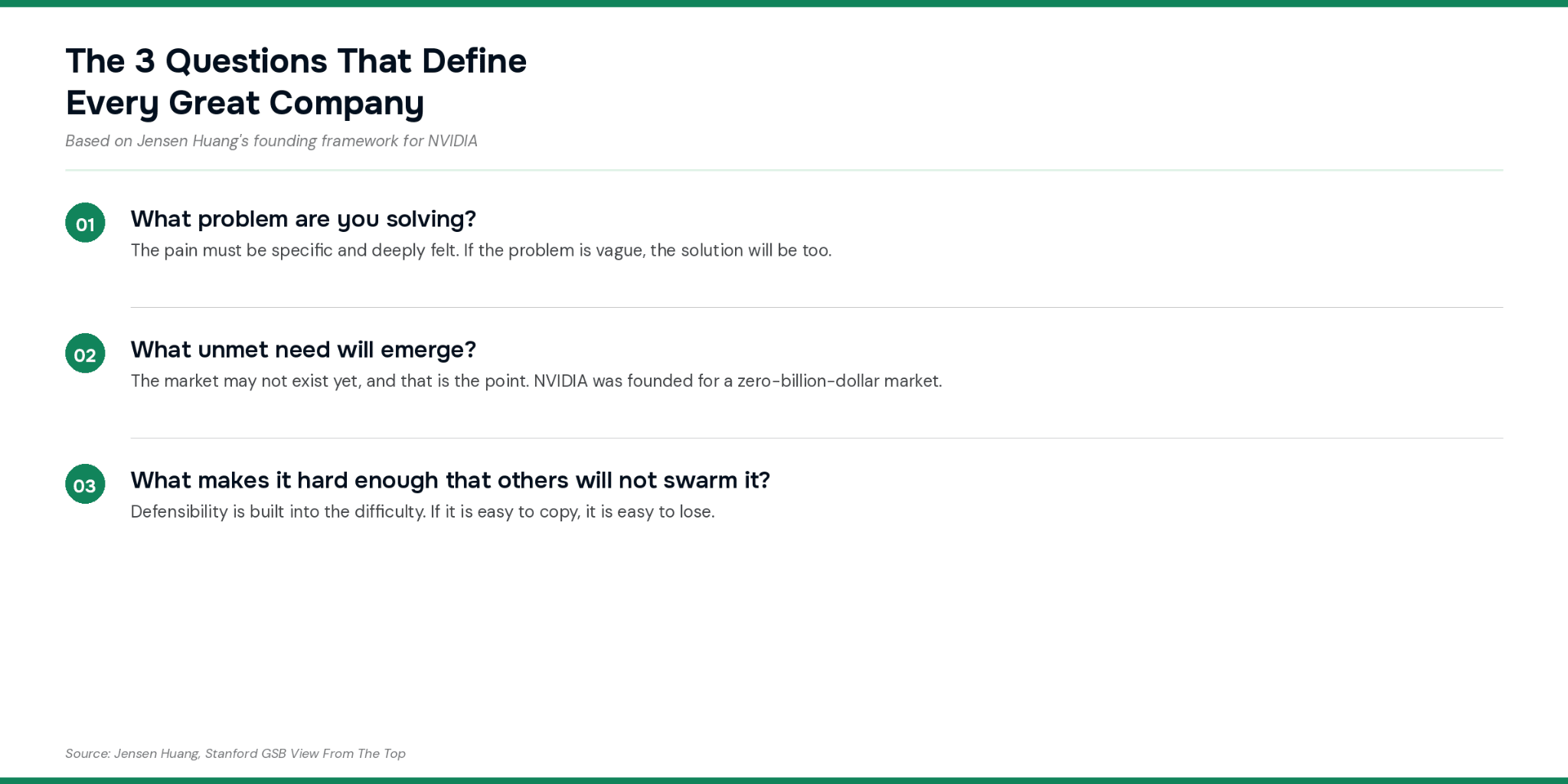 Huang said this to Stanford students, explaining that NVIDIA nearly died multiple times in its first decade. Resilience is built by surviving difficulty, not by avoiding it.