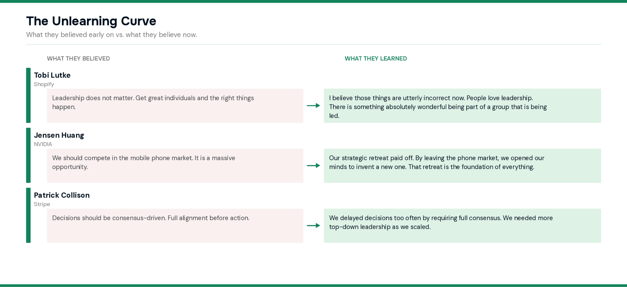 Lütke admitted this on the Acquired podcast, reflecting on his early years as a programmer-turned-CEO. Scaling taught him that orchestrating great individuals into a team requires deliberate leadership, not just talent density.
