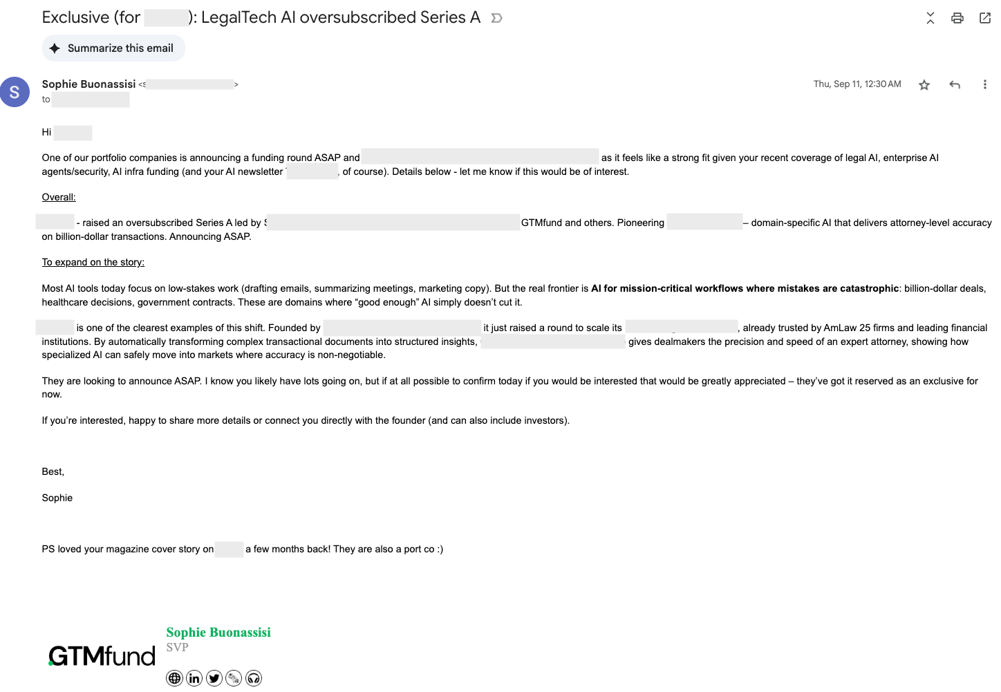 “Hi {{first name}} – really excited to share that we’ll be announcing our $XX [round] raise soon. We’re kicking off the PR process and are targeting {{outlet}} and {{outlet}}. Wanted to reach out and see if you happen to have any contacts at those outlets, before we dive into things from our end.”